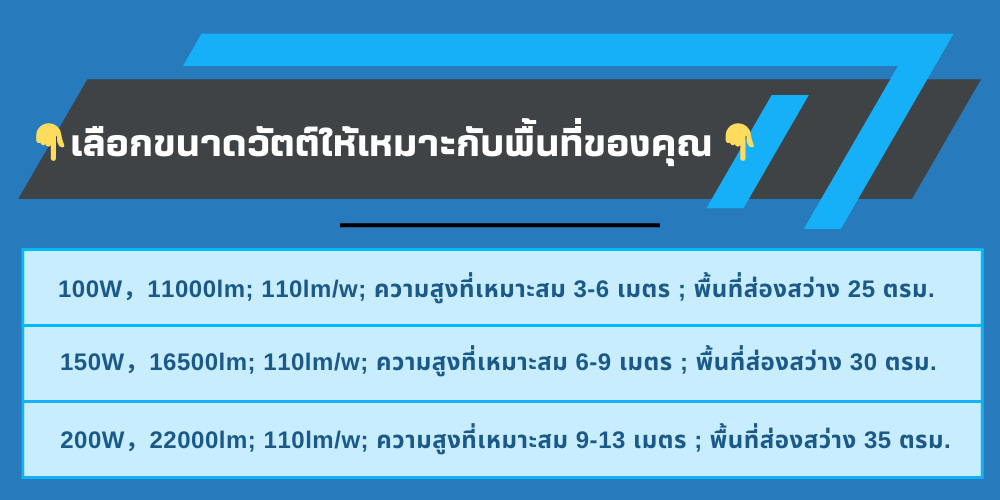 100W,11000lm; 110lm/w; ความสูงที่เหมาะสม 3-6 เมตร ; พื้นที่ส่องสว่าง 25 ตรม.