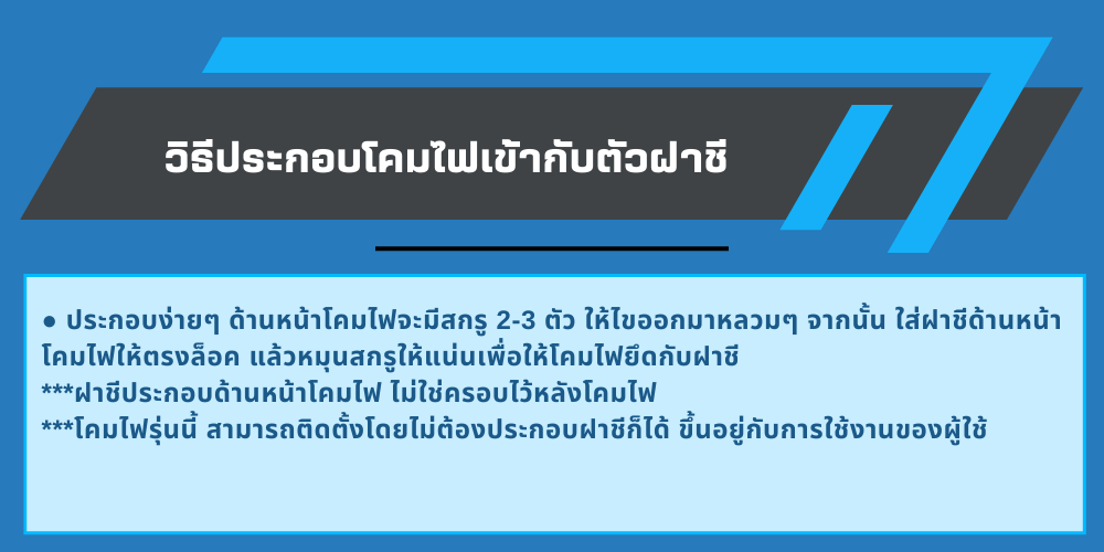● ประกอบง่ายๆ ด้านหน้าโคมไฟจะมีสกรู 2-3 ตัว ให้ไขออกมาหลวมๆ จากนั้น ใส่ฝาชีด้านหน้าโคมไฟให้ตรงล็อค แล้วหมุนสกรูให้แน่นเพื่อให้โคมไฟยึดกับฝาชี