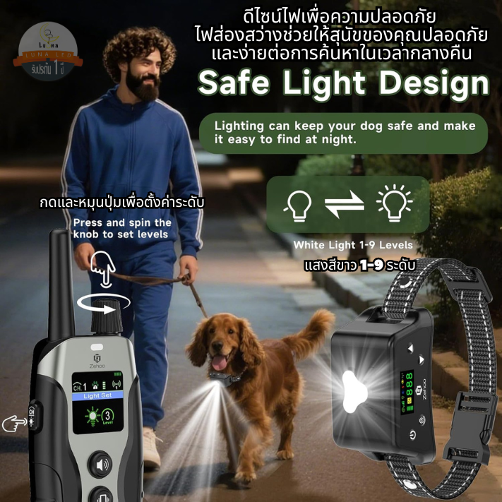 มีไฟปรับได้ 1-9 ระดับ ซึ่งมีประโยชน์มากสำหรับการตั้งแคมป์หรือเดินเล่นในเวลากลางคืน เพียงแค่เปิดไฟจากรีโมท คุณก็สามารถหาสุนัขของคุณได้ง่าย หรือเปิดไฟไว้เพื่อนำทางในเวลากลางคืน